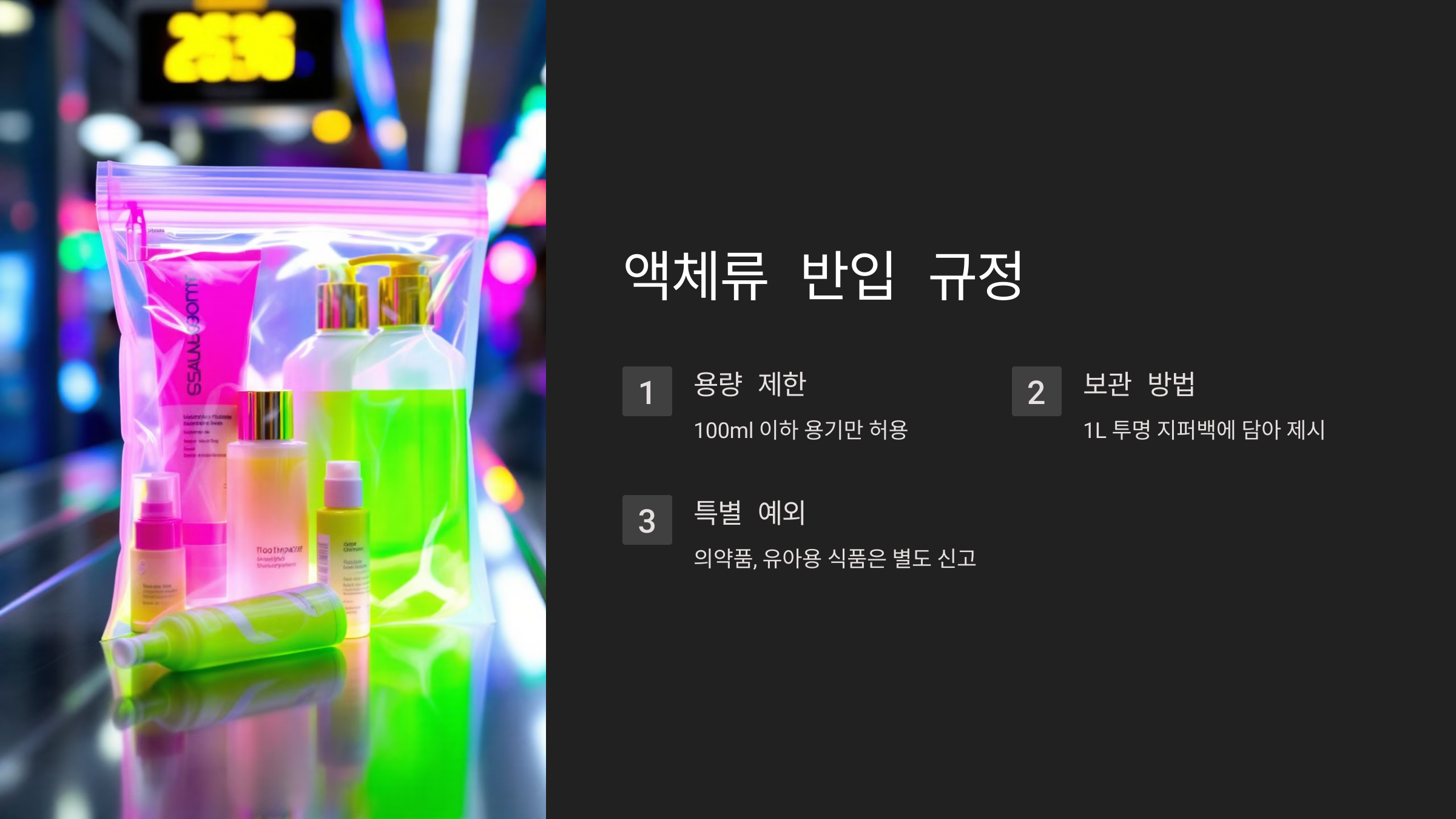 💡 **팁:** 액체류를 기내 반입하려면 **100ml 이하의 용기에 나누어 담고, 투명 지퍼백에 보관하는 것이 기본!** 🛂