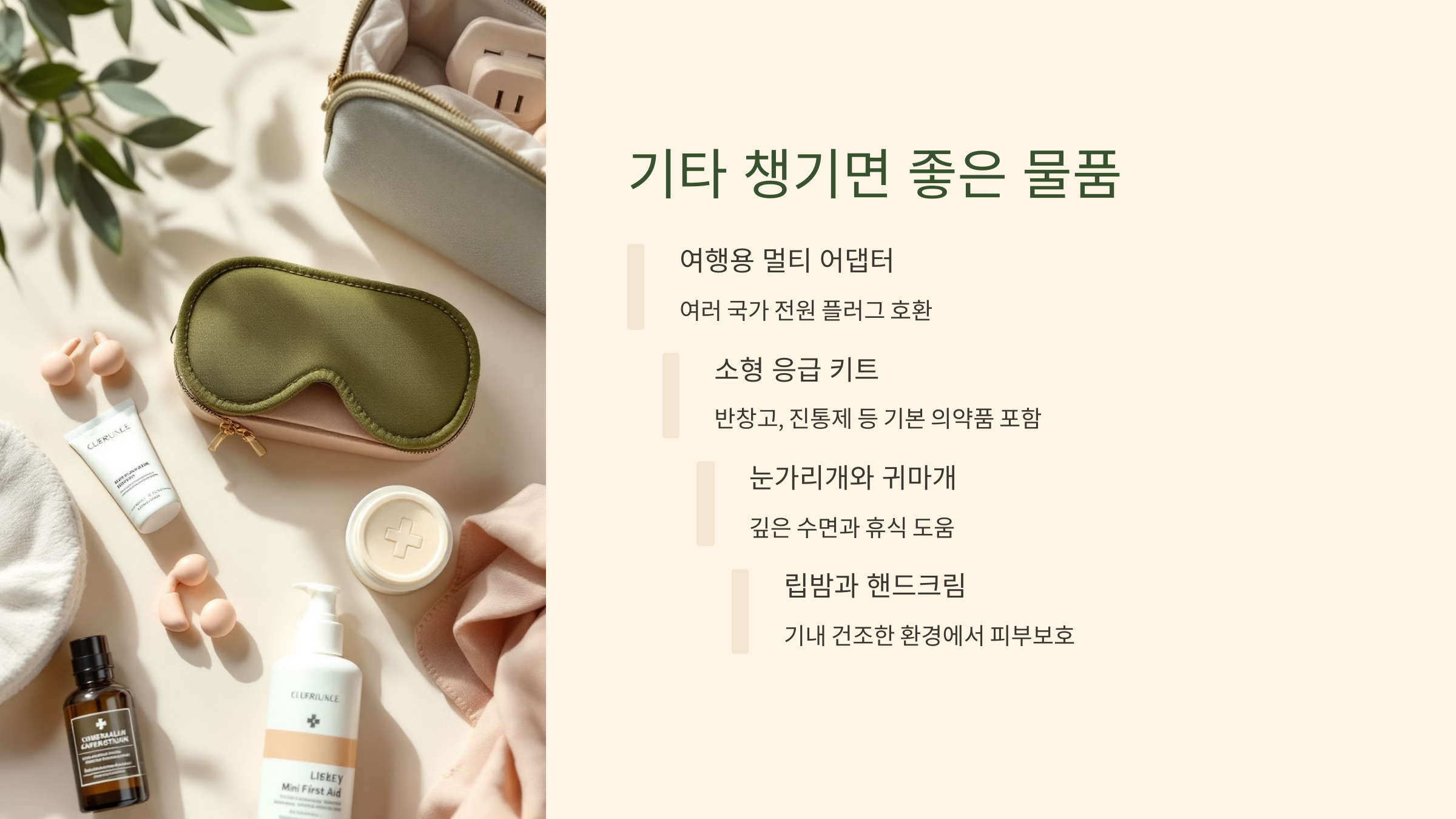 | 아이 마스크 | 빛을 차단해 숙면 유도 | 낮 비행이나 밝은 기내에서 유용 |