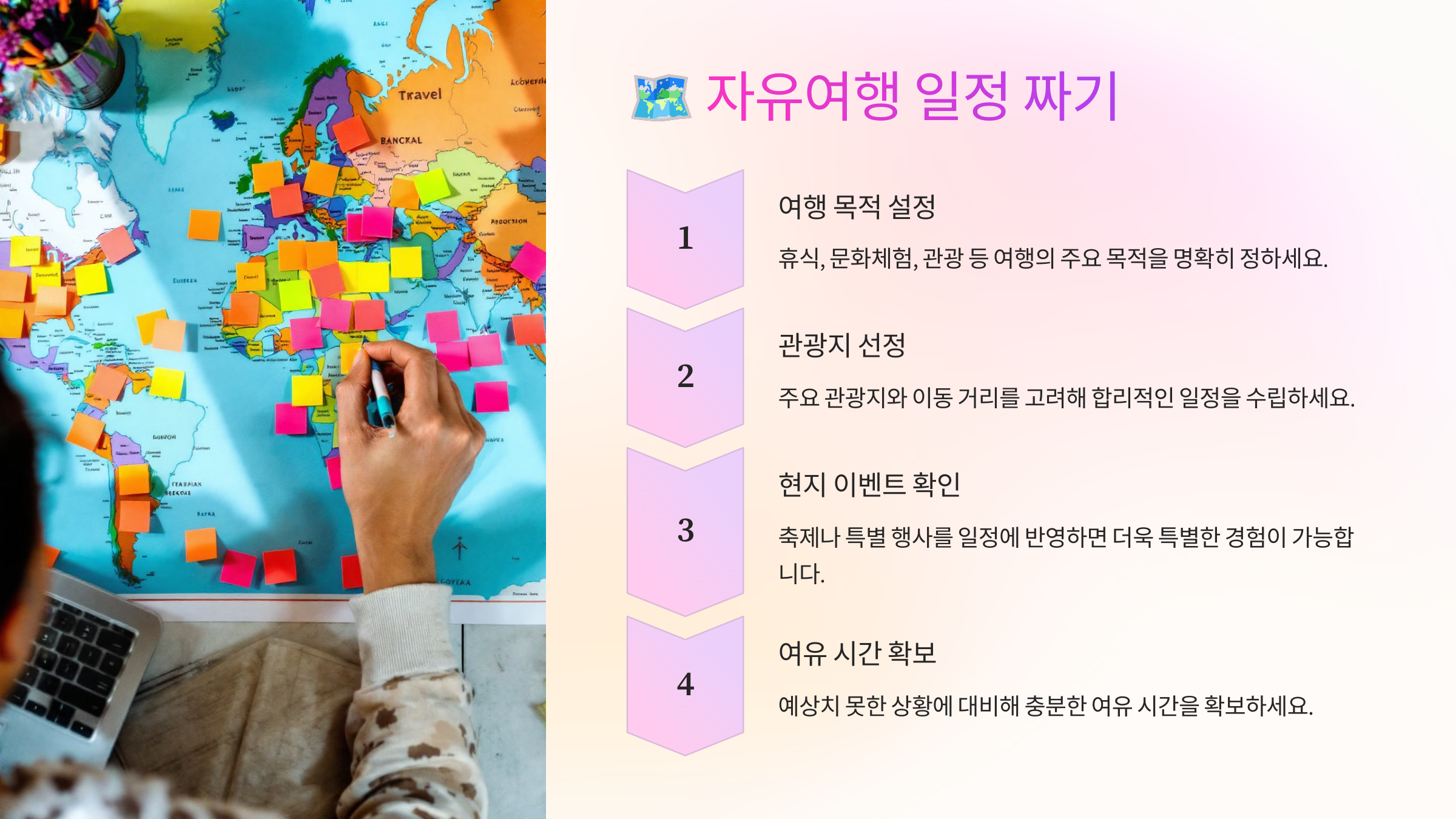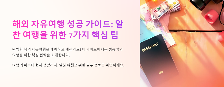 그래서 오늘은 **성공적인 자유여행을 위한 핵심 팁**을 정리해 볼게요! 📝 일정 짜는 법부터 예산 관리, 숙소 선택, 교통 이용법까지 꼼꼼하게 알려드릴게요. ✈️