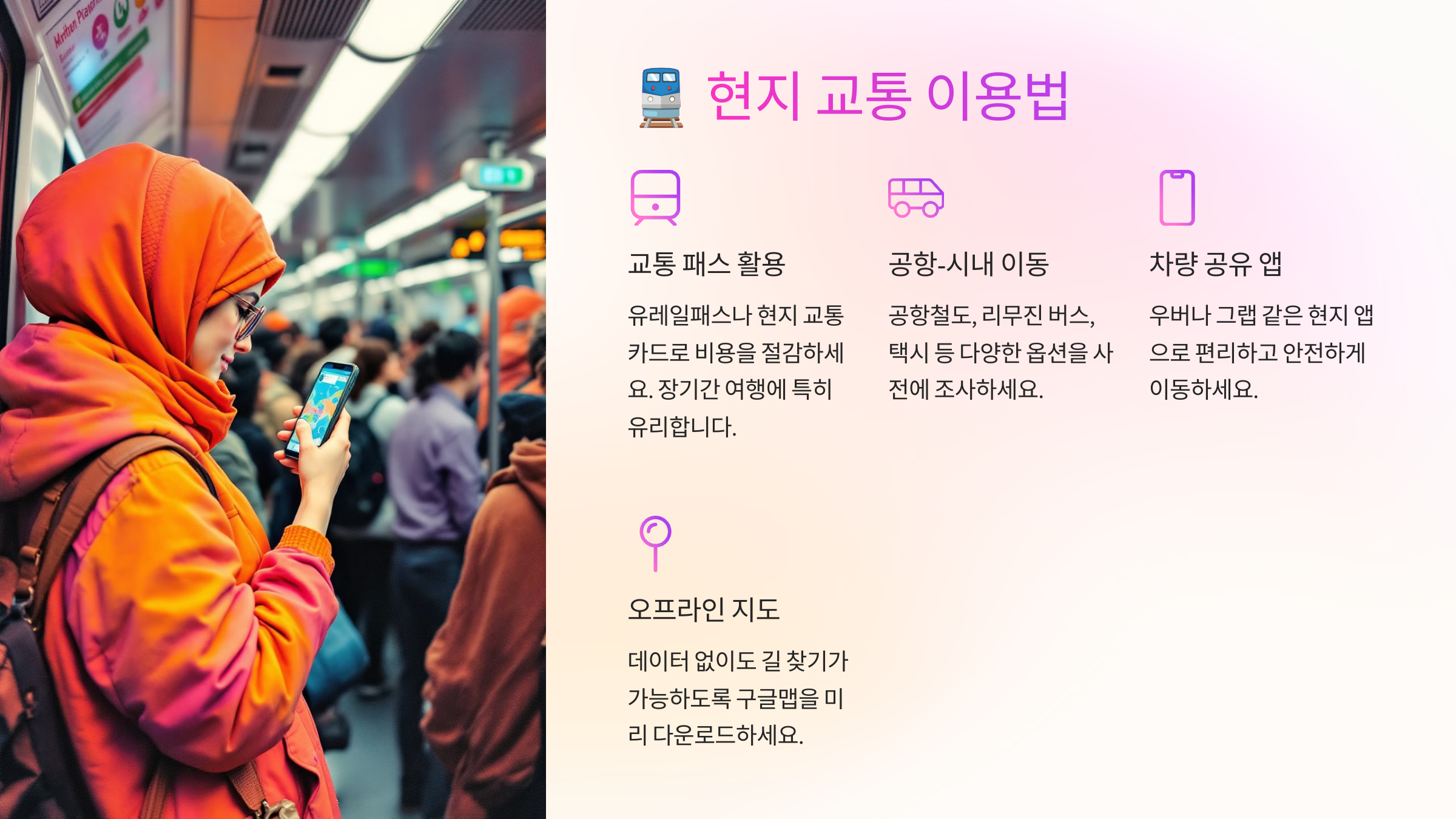✔️ **대중교통 이용** 대도시에서는 지하철과 버스가 가장 효율적인 교통수단이에요. 교통카드를 사전 구매하면 요금을 절약할 수 있고, 환승도 편리하게 이용할 수 있어요.