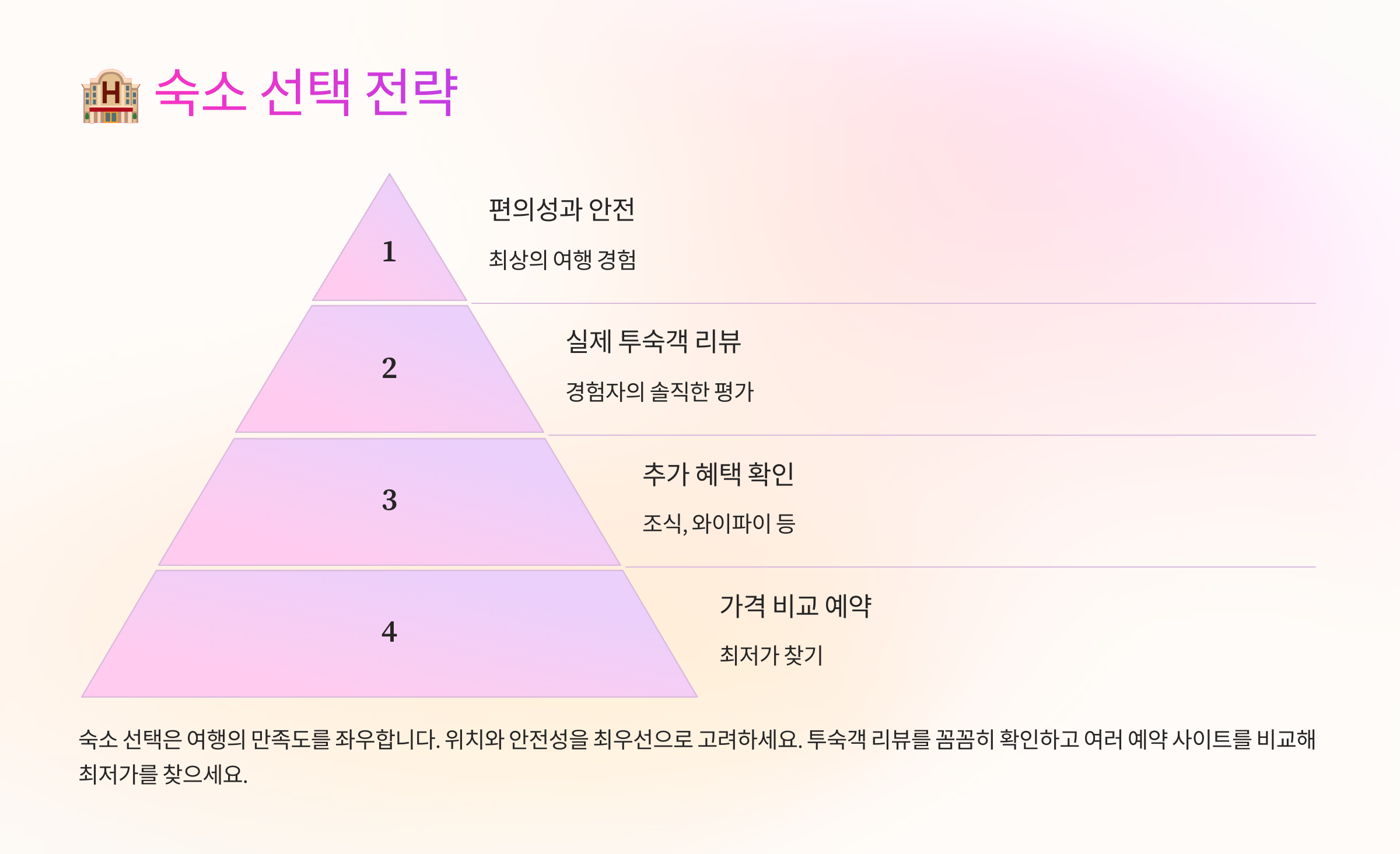 숙소 선택은 여행의 만족도를 크게 좌우하는 요소예요. 교통이 불편하거나 시설이 좋지 않으면 여행 내내 불편을 겪을 수 있어요. 따라서 숙소를 고를 때는 **위치, 가격, 후기**를 꼼꼼히 따져보는 것이 중요해요.