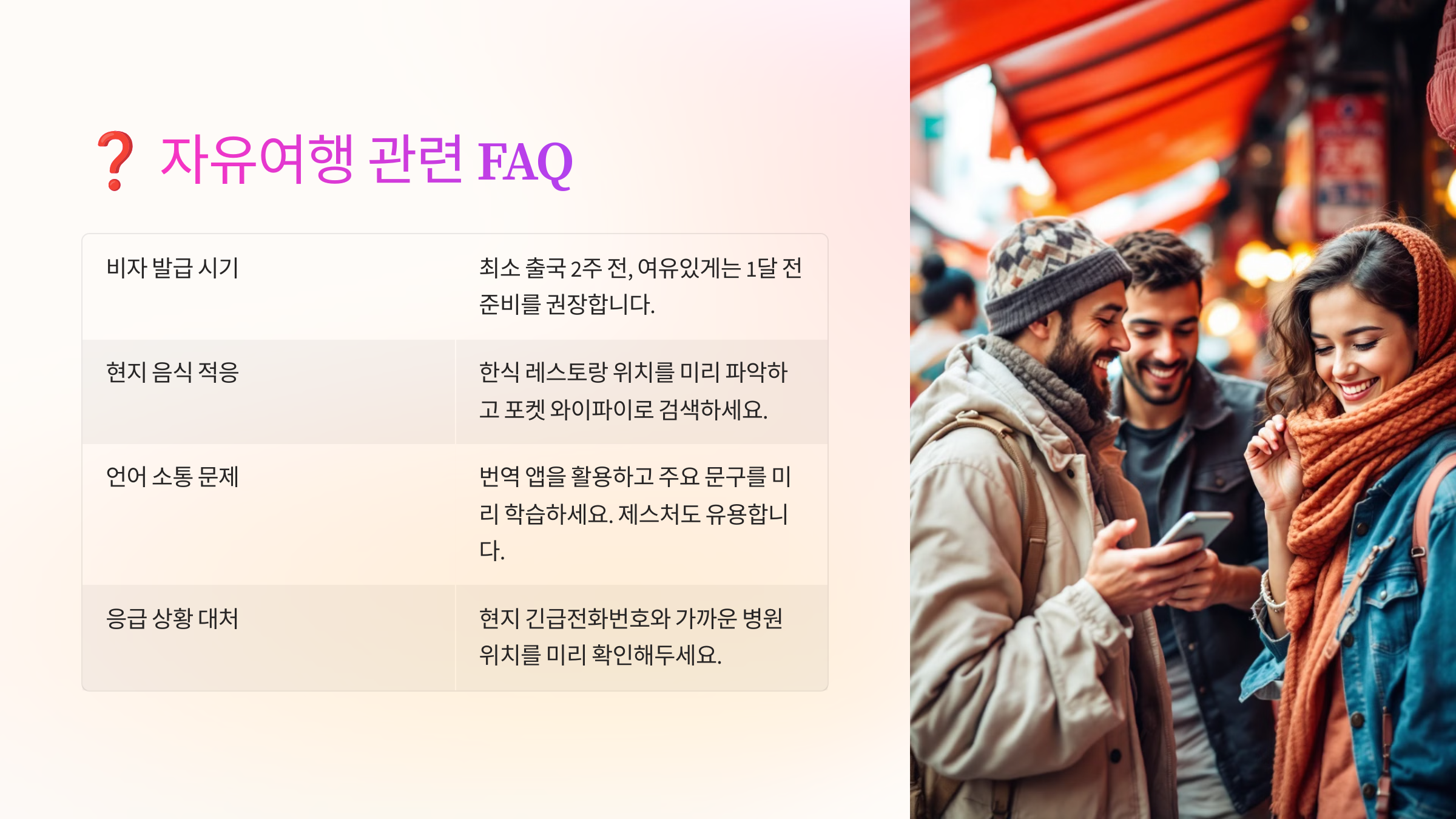 자유여행을 계획할 때 궁금한 점들이 많을 텐데, 위의 FAQ가 도움이 되었길 바라요! ✈️ 여행 준비를 철저히 해서 즐거운 시간을 보내세요. 😊