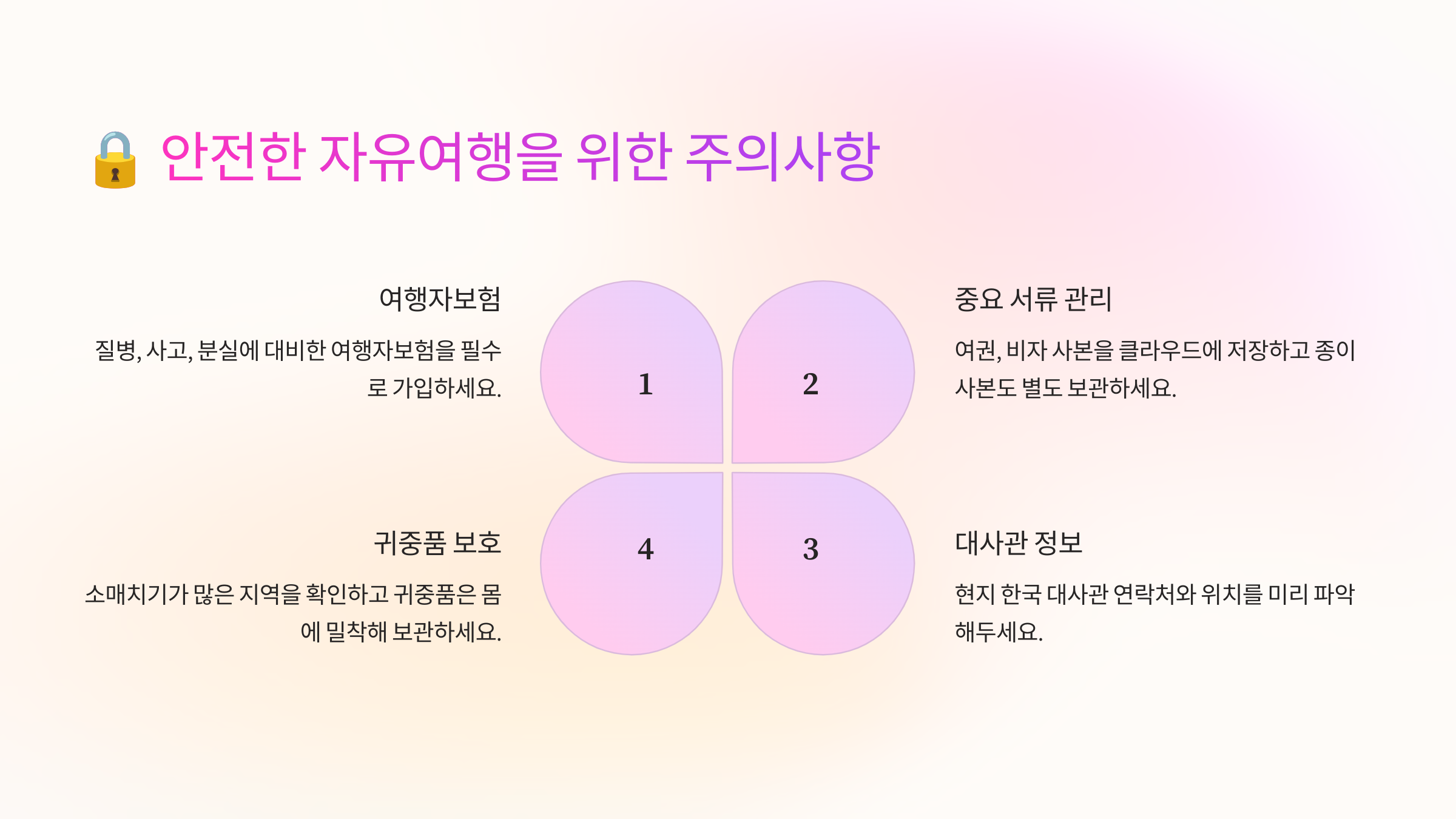자유여행에서는 모든 일정과 이동을 스스로 관리해야 하기 때문에 **안전이 최우선**이에요. 특히 낯선 나라에서는 예상치 못한 상황이 발생할 수 있으므로, 미리 대비하는 것이 중요해요.