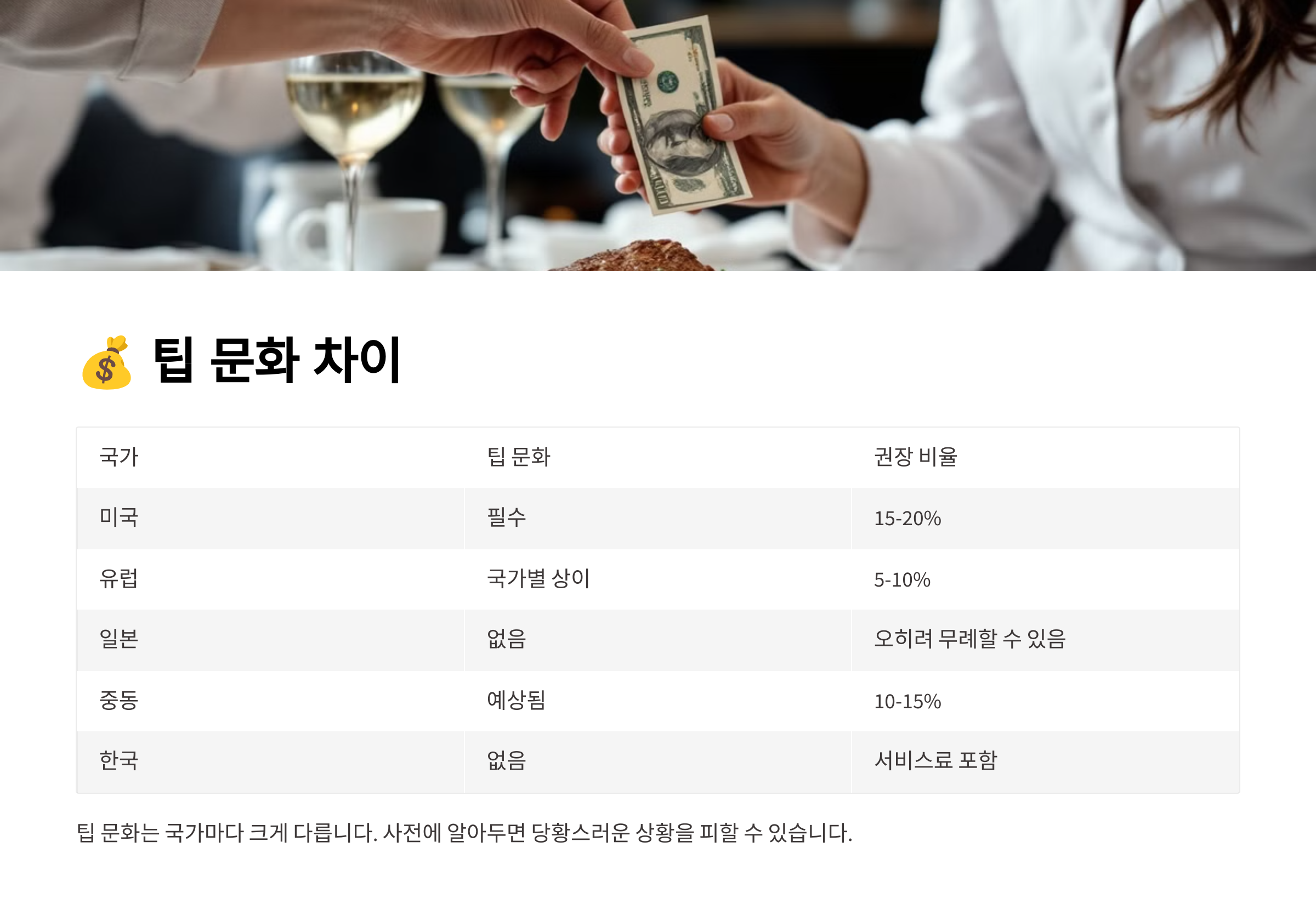 💡 **팁:** 팁을 줘야 하는 나라에서는 **현금으로 준비**하는 것이 좋아요! 카드 결제 시 자동 포함되지 않는 경우도 있기 때문이에요. 💵