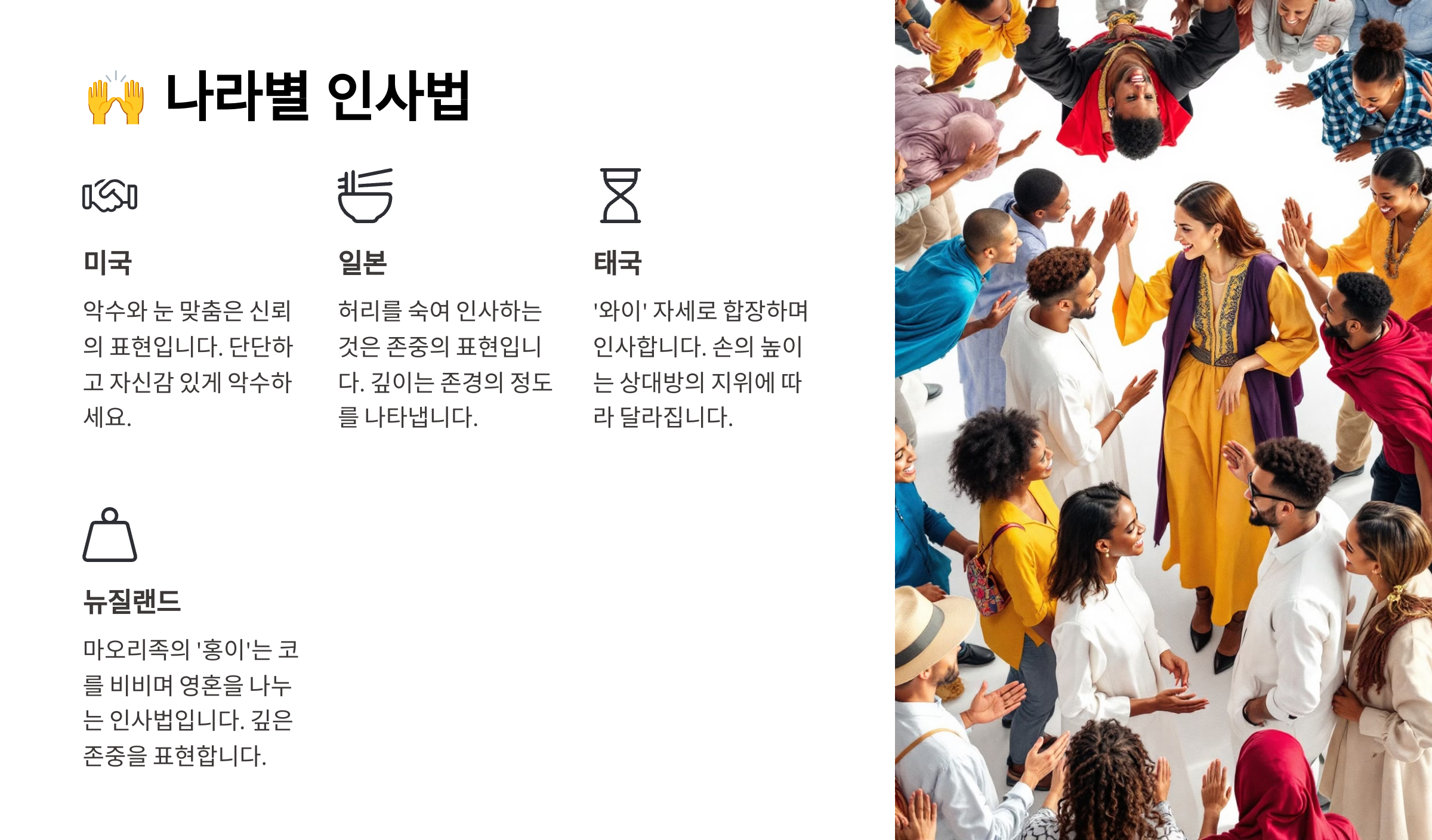 각 나라마다 인사하는 방식이 달라요! 한국에서는 고개를 숙이는 것이 자연스럽지만, 다른 나라에서는 **악수, 포옹, 키스** 등 다양한 방식으로 인사해요. 🤝