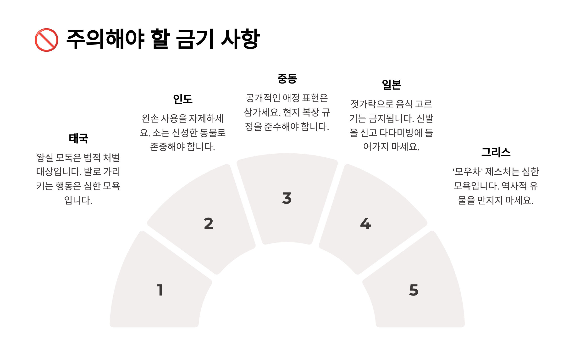 해외에서는 한국과 다른 **금기 사항**이 있어요. 실수로 하면 상대방을 불쾌하게 할 수도 있으니, 여행 전에 꼭 알아두세요! 😯