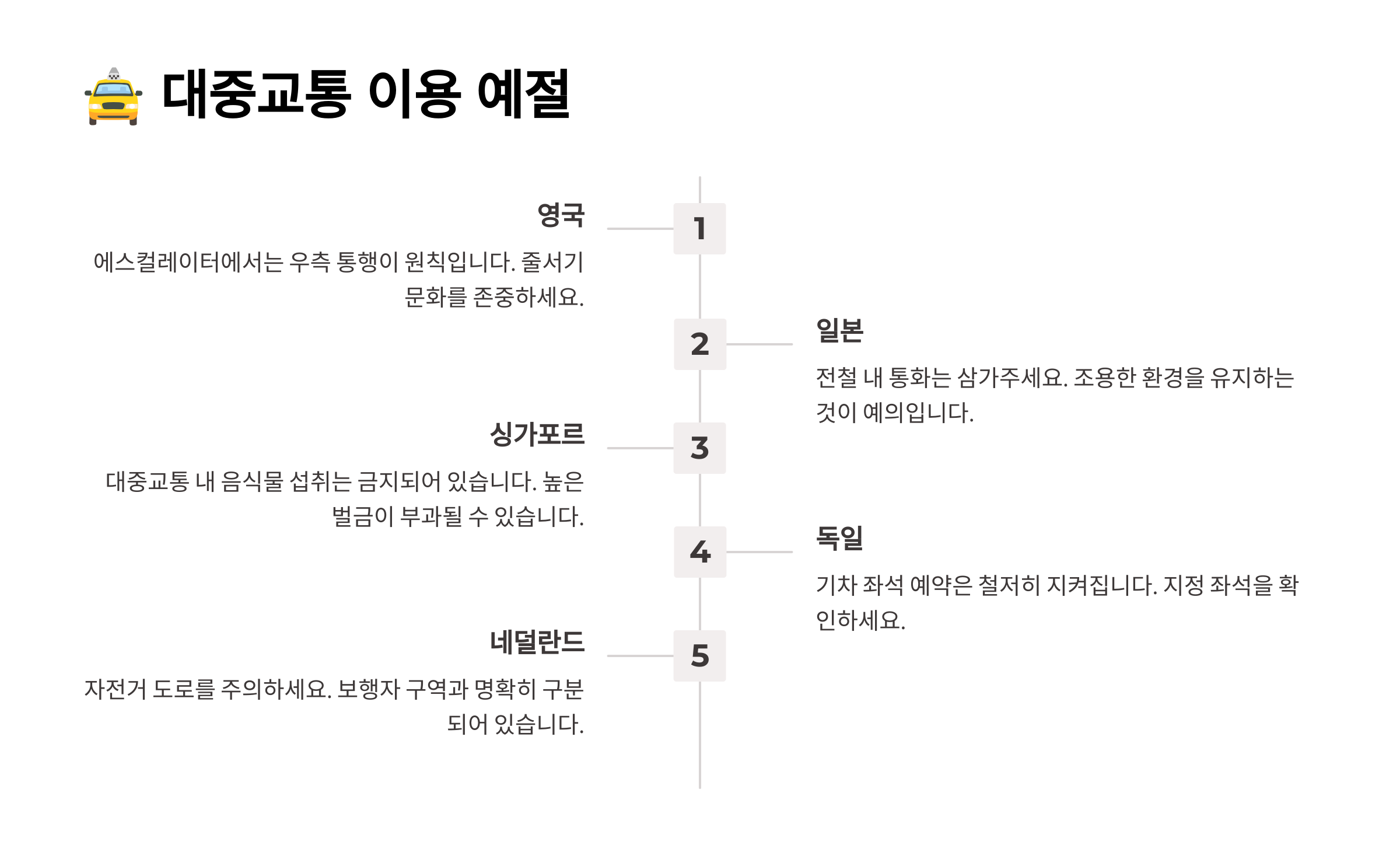 해외에서는 대중교통 이용 시 **현지의 교통문화**를 잘 지켜야 해요! 🚋 나라별로 지켜야 할 규칙이 다르고, **무심코 한 행동이 실례가 될 수도 있어요.**