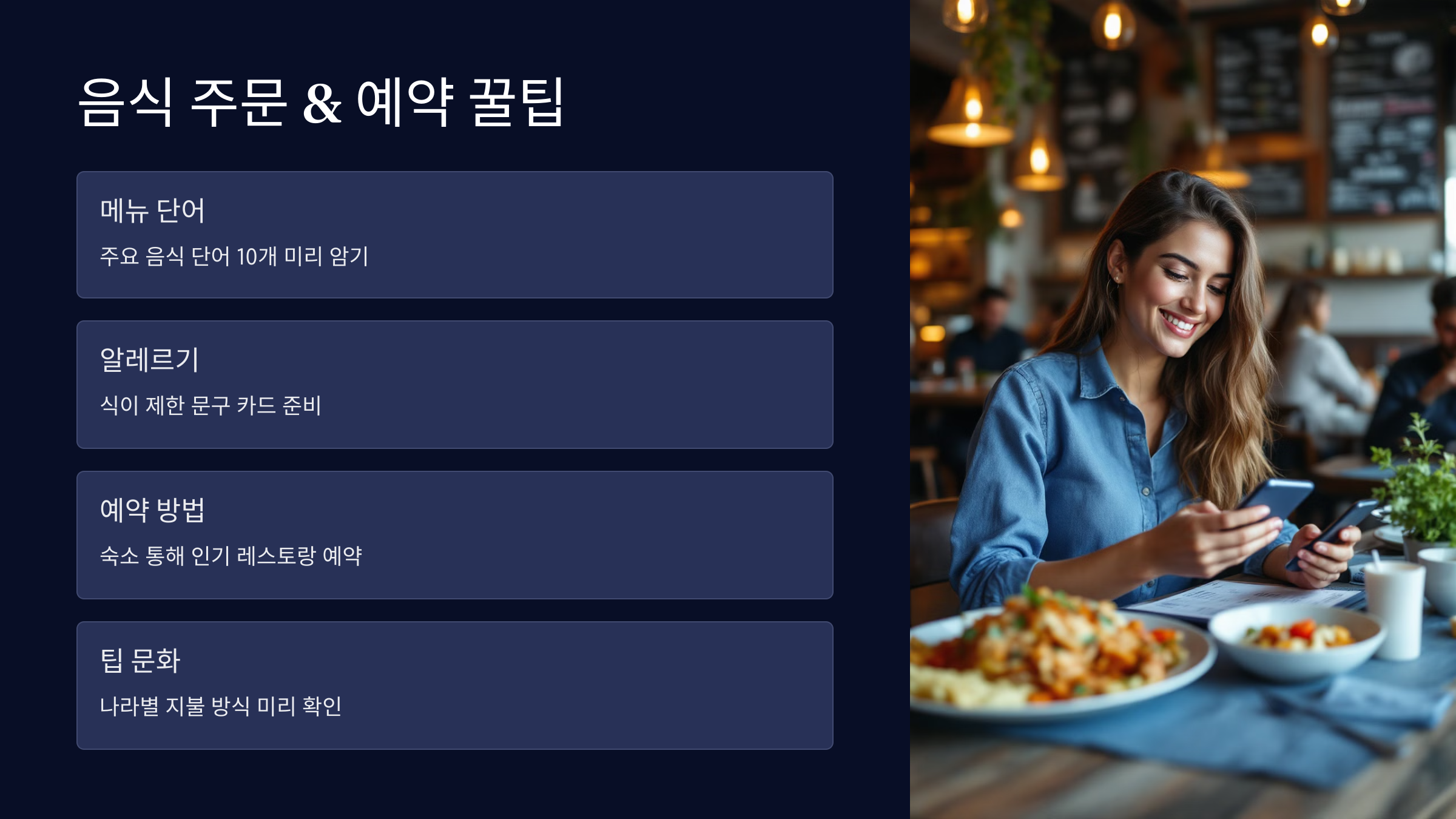 하지만, 몇 가지 꿀팁만 알면 **음식을 더 쉽게 주문하고, 레스토랑 예약도 문제없이 할 수 있어요!** 🍽️✨