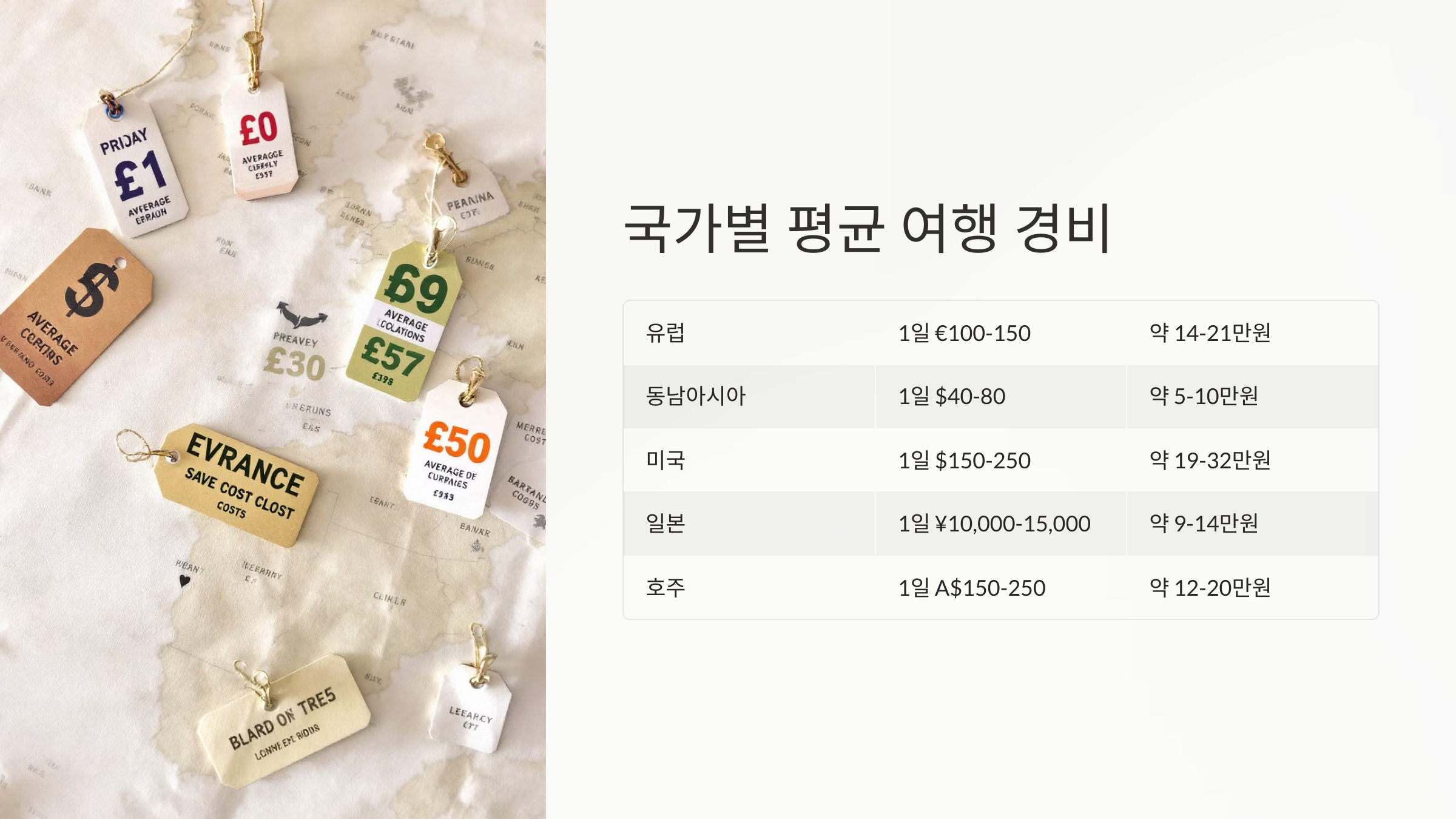 여행 예산을 계획할 때, 방문하는 나라의 평균 물가를 아는 것이 중요해요! 💰 각 나라별 하루 예상 경비를 확인하고, 예산을 효율적으로 짜보세요. ✈️