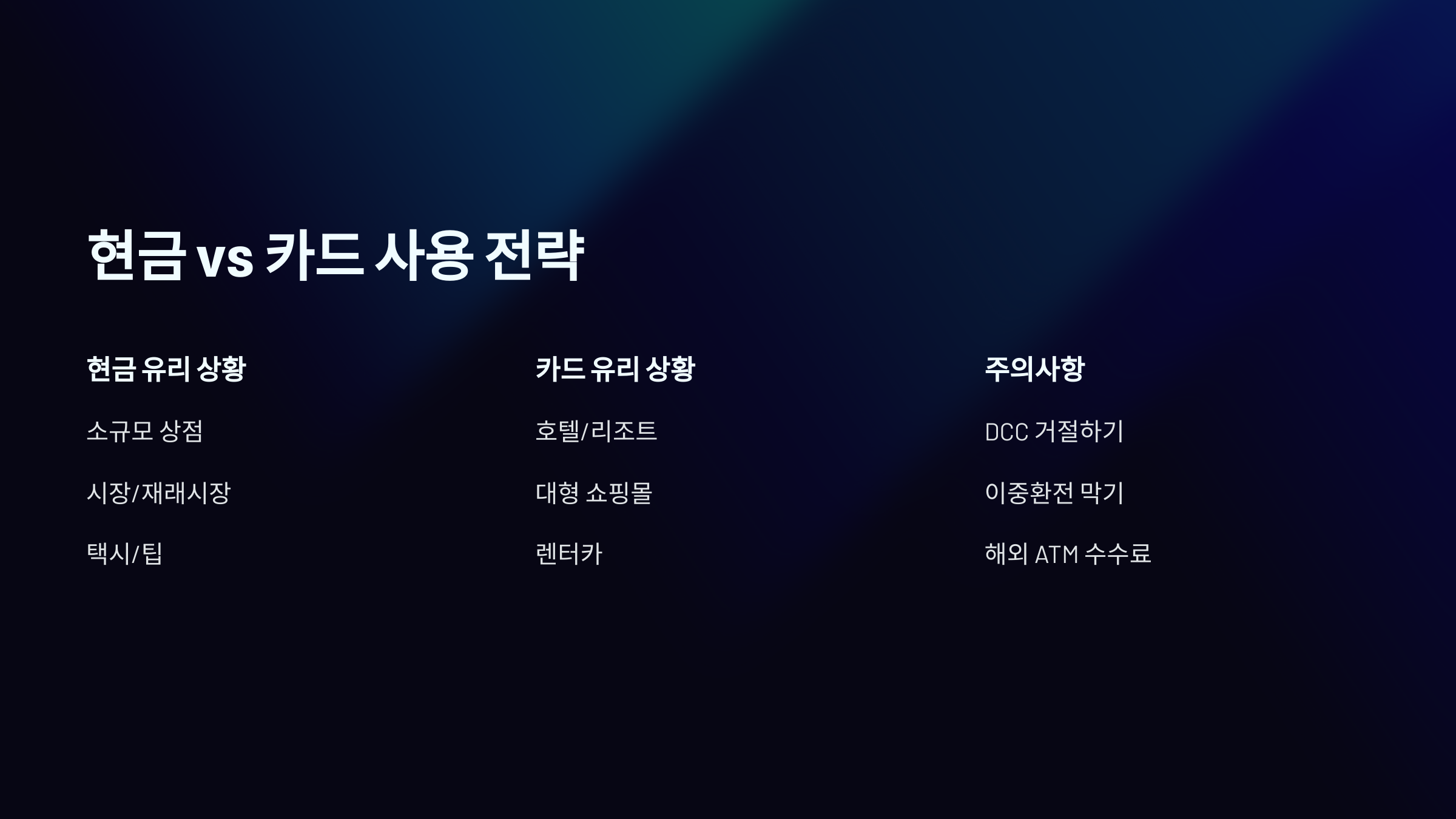 - 🏧 **ATM 출금** → 편리하지만 해외 출금 수수료 발생