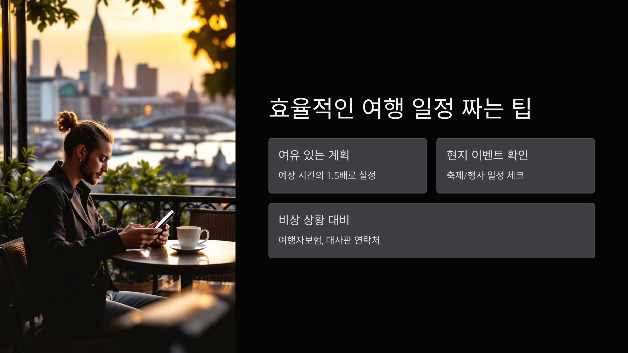 내가 생각했을 때, 여행의 핵심은 **‘균형’**이에요. 너무 빡빡한 일정은 여행을 힘들게 만들고, 너무 여유로운 일정은 예상보다 많은 시간을 낭비할 수 있어요. 그렇다면 어떻게 하면 알차면서도 여유로운 여행 일정을 짤 수 있을까요? ✈️💡
