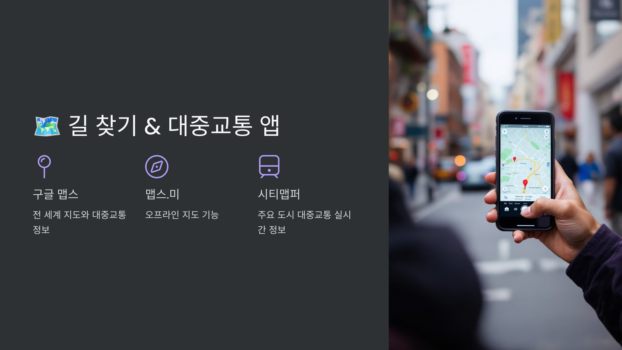 | Citymapper | 대중교통 실시간 정보 제공 | 유럽 및 미국 도시에서 유용 |