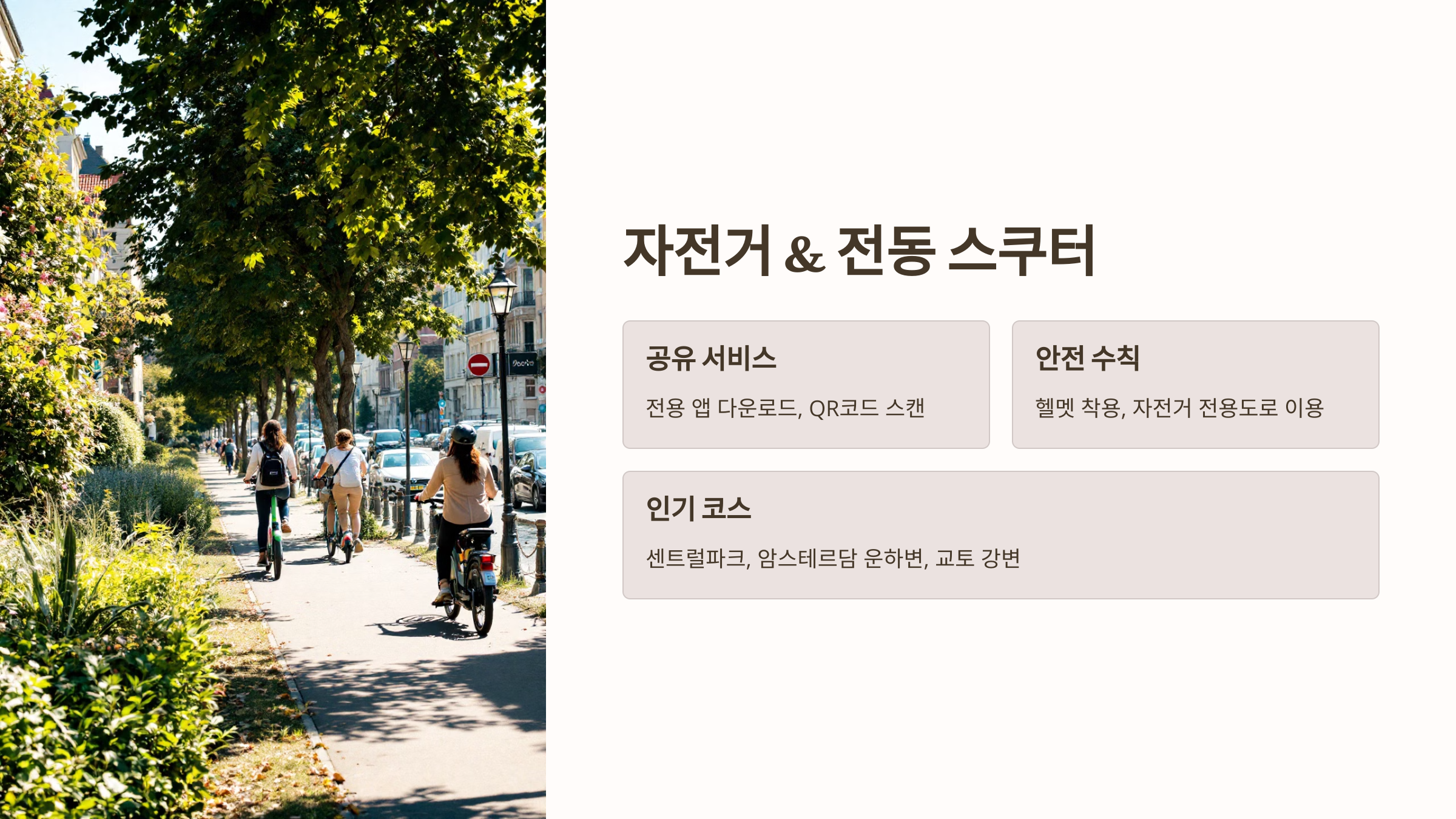 자전거나 전동 스쿠터를 이용하면 **도심 탐방**이 훨씬 편리하고, 짧은 거리는 걷기보다 빠르게 이동할 수 있어요. 다만, **이용 규칙을 잘 지키고 안전을 최우선으로** 해야 해요! 🚴♀️⚠️