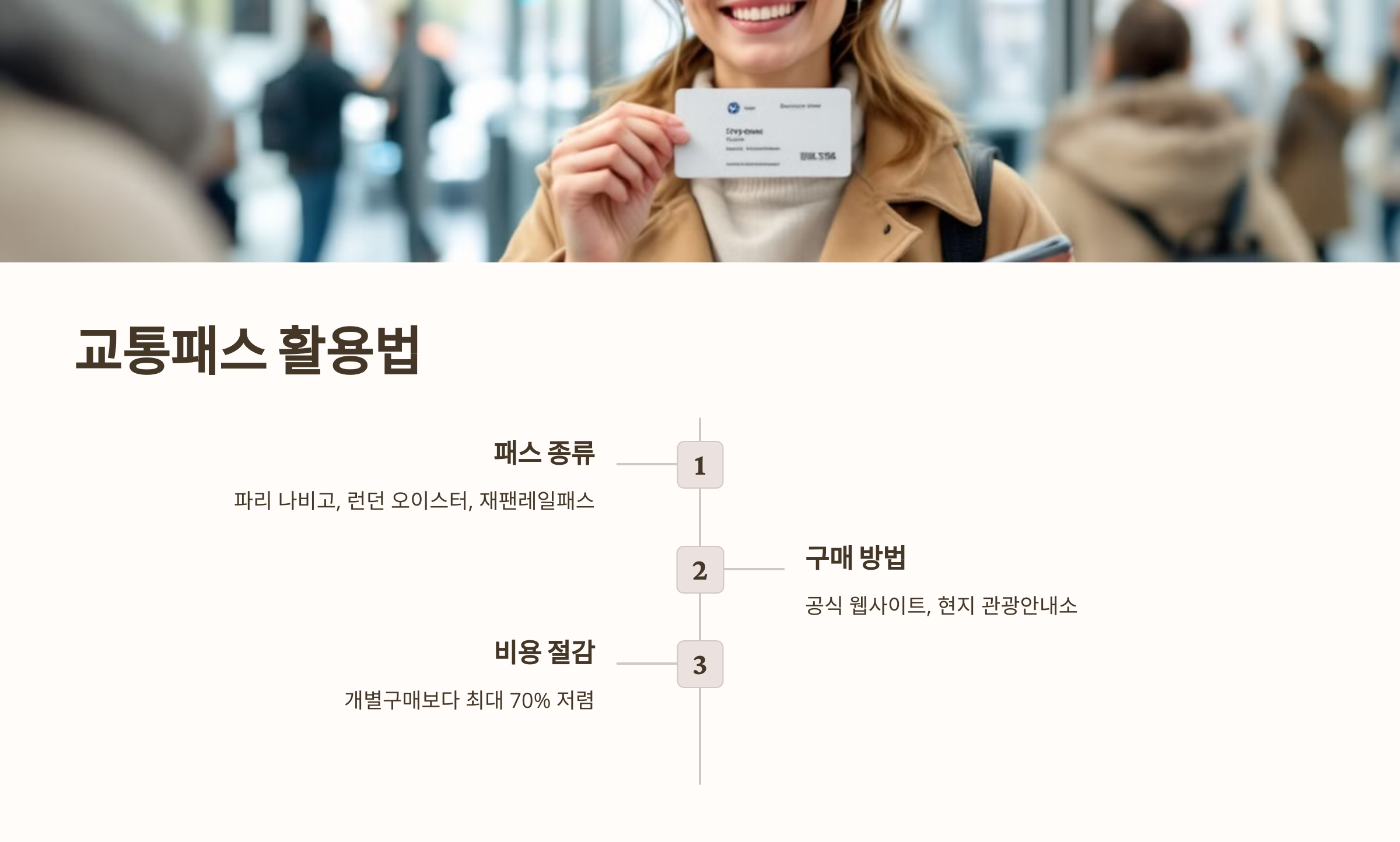 교통패스는 일정 기간 동안 무제한으로 대중교통을 이용할 수 있는 카드예요. 나라별로 다양한 종류가 있으니 **여행 일정과 이동 거리**에 맞춰 적절한 패스를 선택하는 것이 중요해요! 🚆🚌
