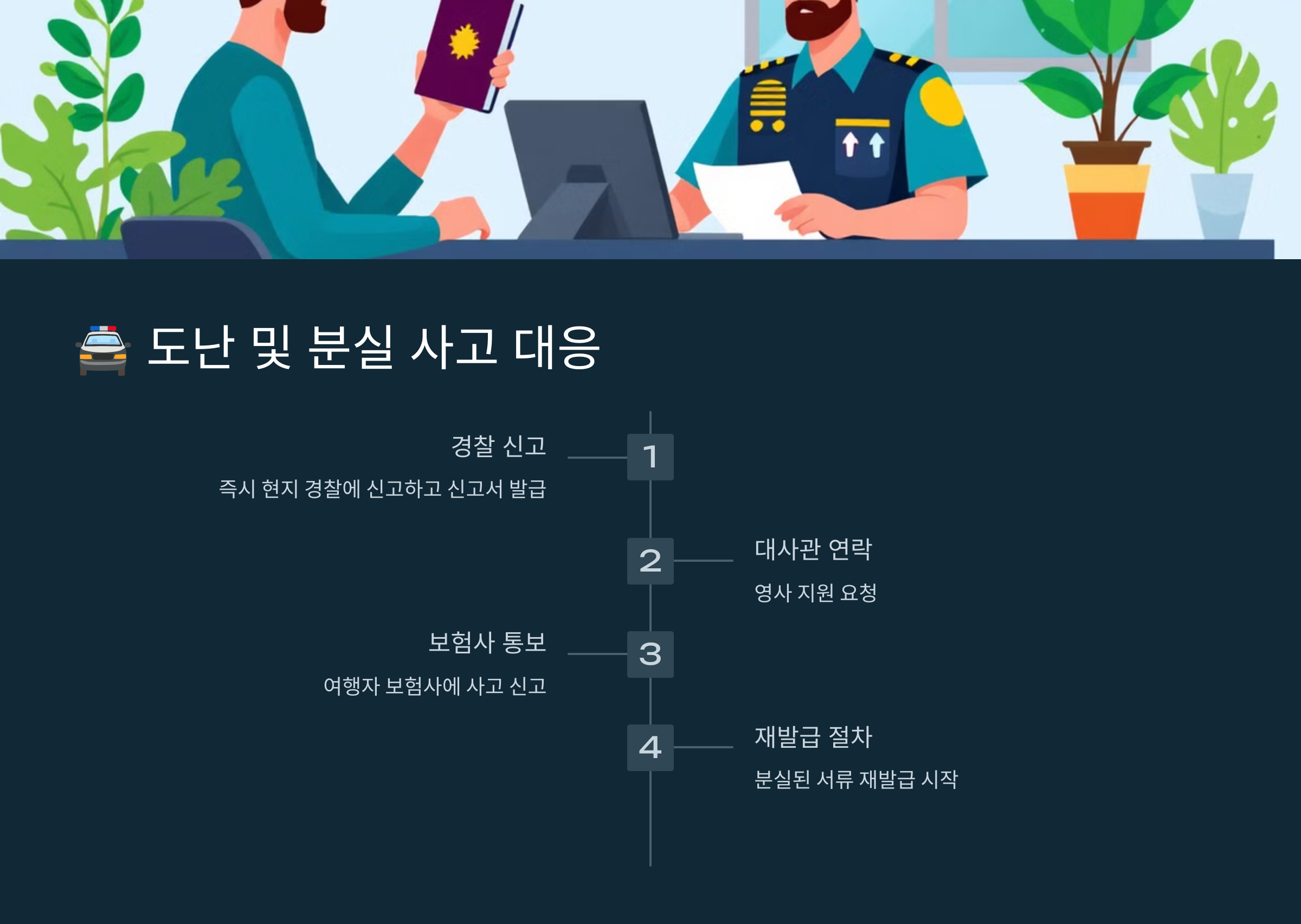 이제 해외에서 도난 및 분실 사고가 발생했을 때 어떻게 대처해야 할지 알아볼까요? 🚔