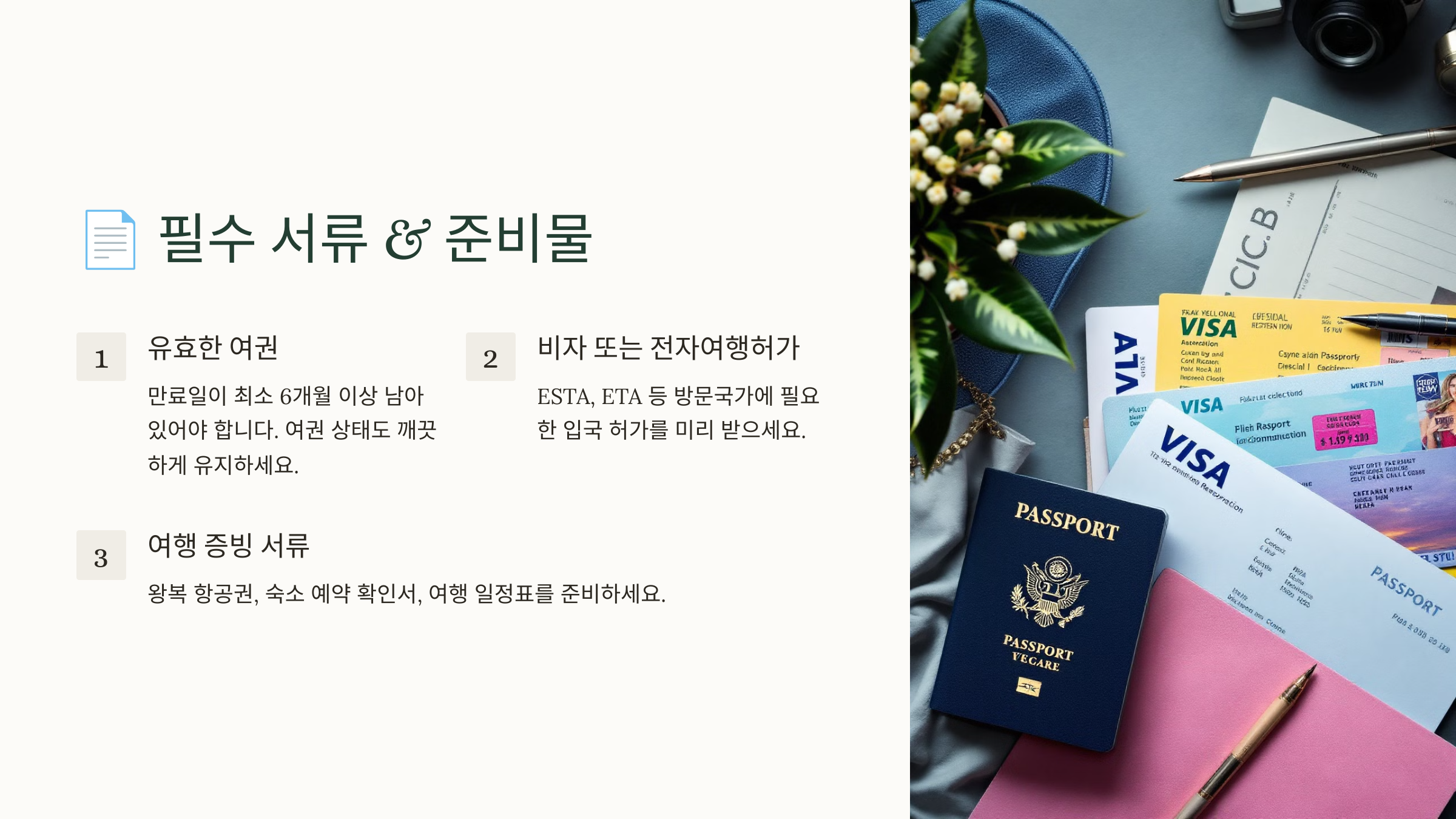 ✔️ **입국 심사 필수 준비물** 📌 **여권** (유효기간 최소 6개월 이상) 📌 **입국 비자 또는 전자여행허가(ESTA, ETA 등)** 📌 **왕복 항공권** (편도 티켓만 있으면 거부될 수 있음) 📌 **숙소 예약 확인서** (체류 계획 증빙) 📌 **여행 일정표** (주요 관광지 & 이동 경로 정리) 📌 **현금 & 신용카드** (체류 중 경비 충당 능력 증빙)