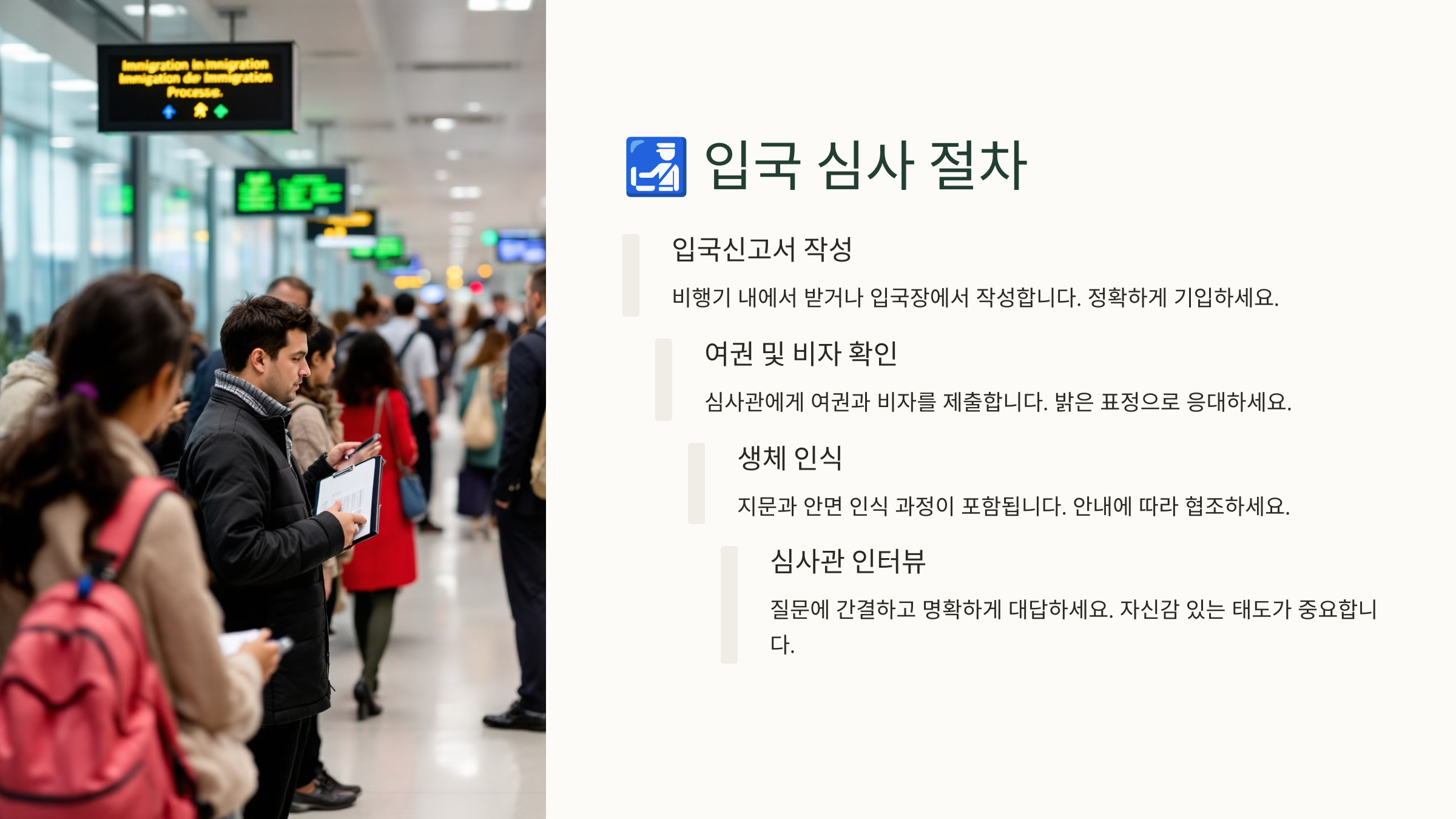 💡 **팁:** 입국 심사 과정에서는 **질문에 짧고 명확하게 답변**하는 것이 중요해요. 불필요한 설명은 피하세요! 🛂