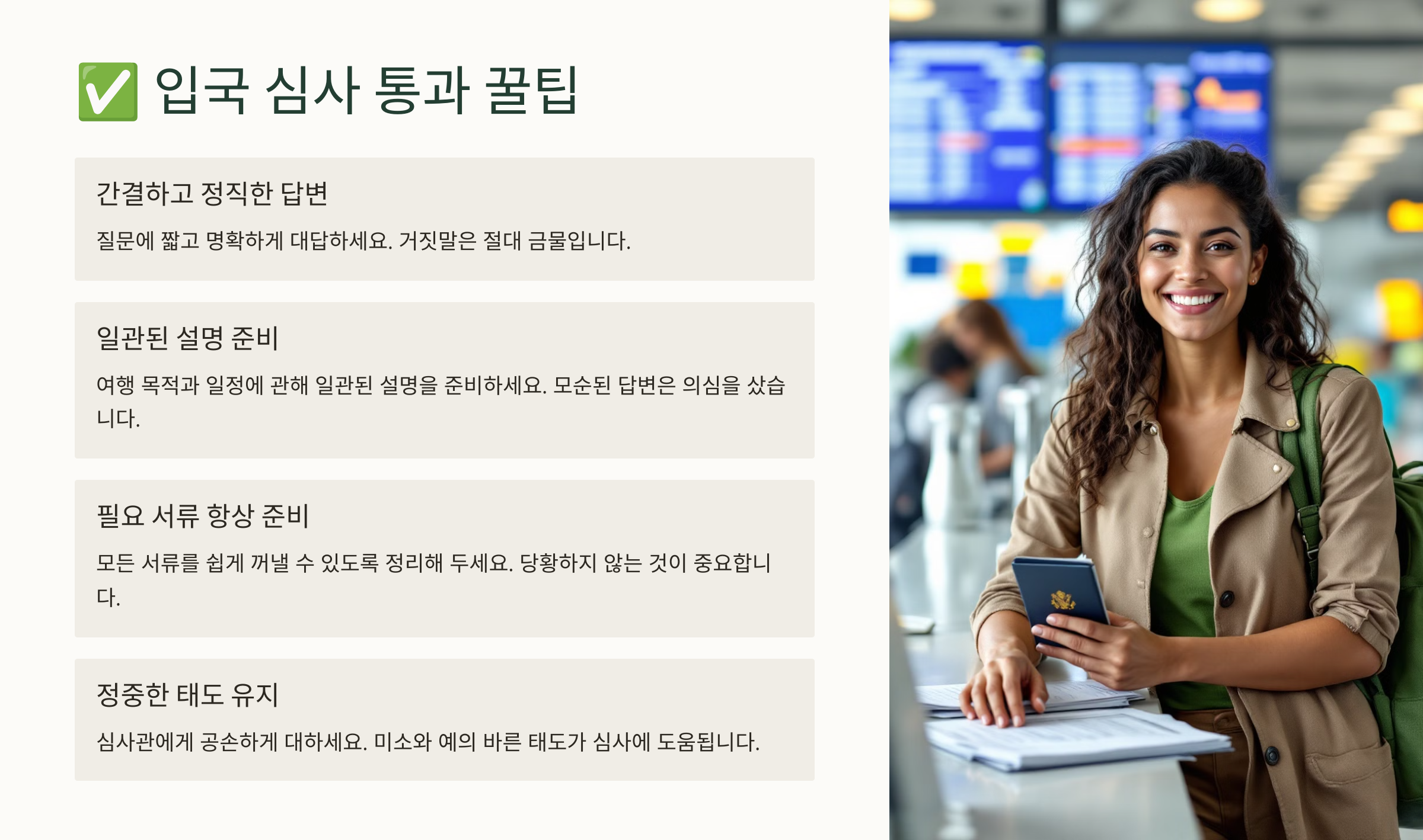 ✔️ **입국 심사 통과를 위한 꿀팁** 📌 **차분한 태도 유지하기** → 긴장하면 의심받을 수 있음 📌 **불필요한 말은 피하기** → 질문에 짧고 정확하게 답변 📌 **깔끔한 옷차림** → 너무 캐주얼한 복장은 피하는 게 좋음 📌 **모든 서류는 손에 들고 준비** → 빠르게 제시할 수 있도록 정리