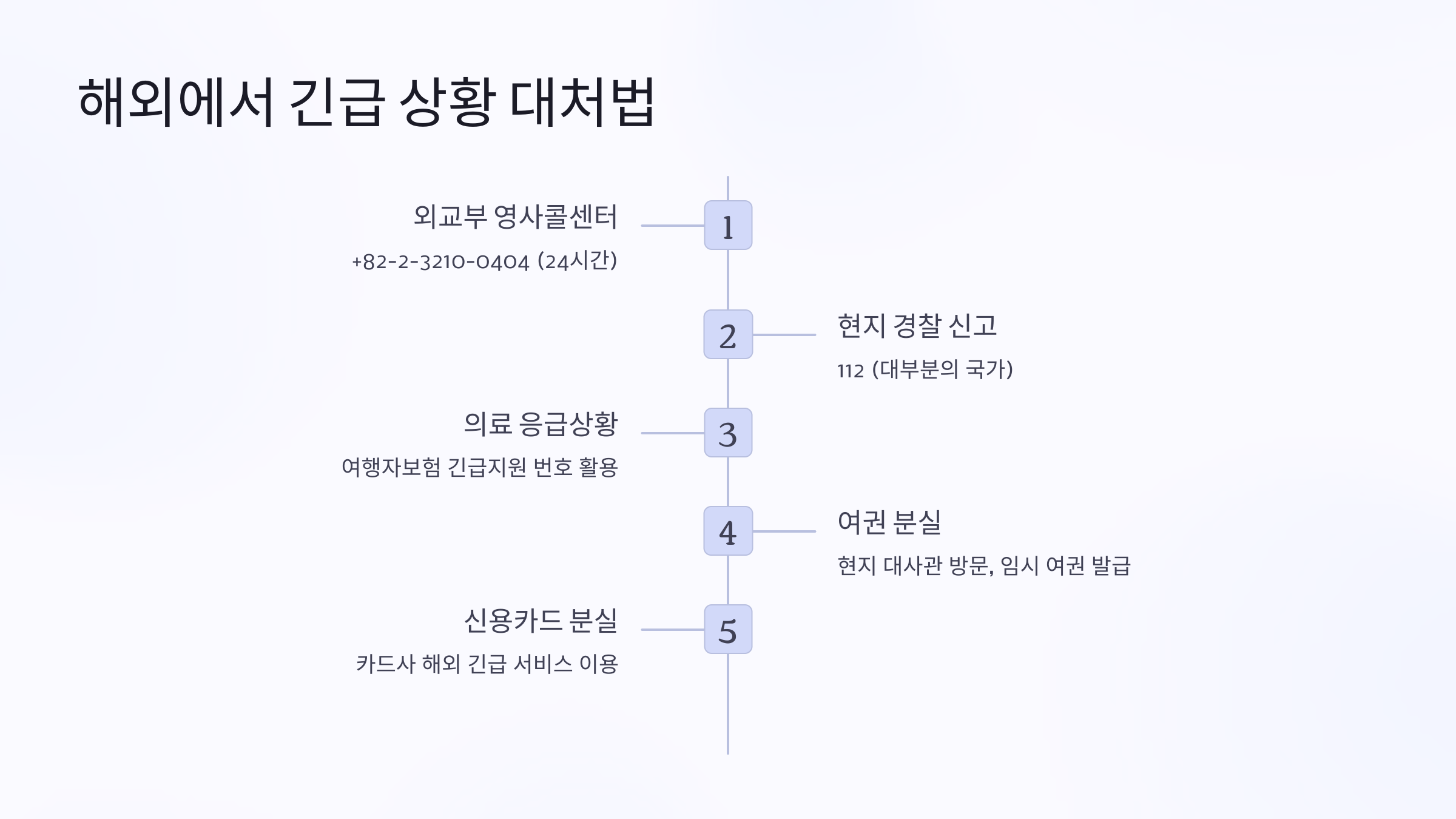 | 여권 분실 | 가까운 한국 대사관 방문 → 여권 재발급 신청 → 임시 여권 발급 |